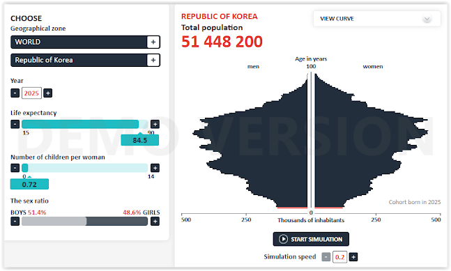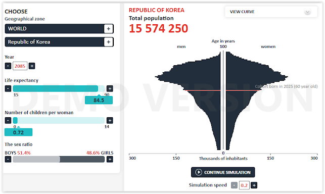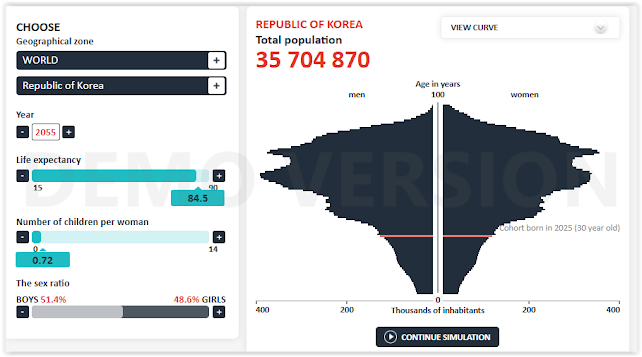 d) This dynamic will not be the most ideal environment for Japanese couples (or any other country) to decide to have more children , since it will also be the younger cohorts who will bear the economic and caregiving burden, so the fall in birth rates will probably only become more pronounced in a positive feedback loop ; in fact, I think it is very likely that the birth rate used in the simulations for Japan of 1.23 for the entire period may be "optimistic", given the trend in recent decades and what is happening, for example, in neighboring countries such as South Korea and China. I also believe that the fall in fertility rates would continue regardless of this problem, but this certainly does not improve it.