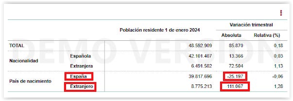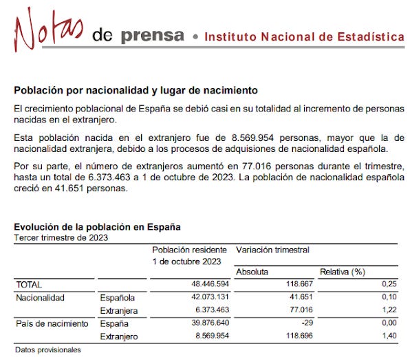 For example, this INE press release for the fourth quarter of 2023 shows that the Spanish-born resident population decreased by 25,197 (approximately 100,000 annually) during that quarter, while the number of residents born abroad increased by 111,067 (approximately 444,000 annually). Furthermore, the average age of this foreign-born population is significantly younger than that of those born in Spain.
