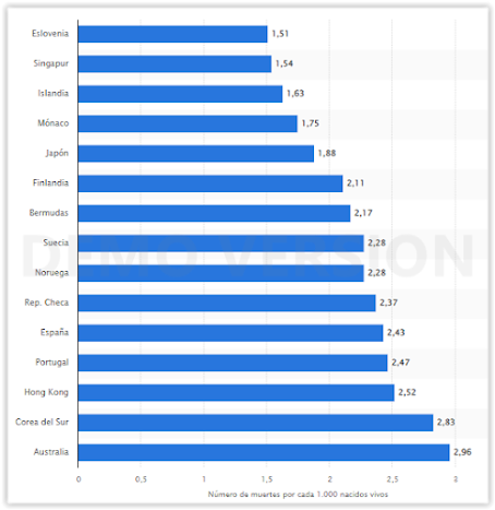 Thus the average infant mortality rate in the world is about 22 per 1000 births, but there are countries that have infant mortality rates 4 or 5 times higher (values of 80 - 100), which are those with the highest fertility rates, and conversely countries with infant mortality rates 10 times lower than the world average, as is the case of developed countries (values of less than 2), which are those with very low fertility rates.