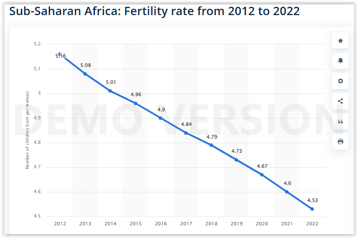 The rate of decline in fertility rates in sub-Saharan Africa between 2012 and 2022 is approximately 0.63 children/woman per 10 years (down from 5.16 to 4.53); so if this trend continues, the fertility rate in sub-Saharan Africa will reach the replacement rate (2.1) in about 38 years, in 2060 (more or less in 1 generation from now), although the population will still continue to grow, it will face the same problems as the rest of the countries, and then the last great "reserve" of human beings on the planet will have been exhausted in about 2 generations (60 years from now), and much earlier I estimate that there will be few young Africans (men and women) available to emigrate and support the populations of an aging "rest of the world", which if the current situation continues, will "fade out".