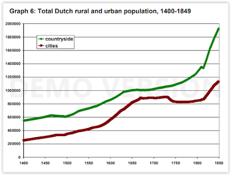 History of a reversal of these trends, for example as a result of a re-ruralization of the population , although there were some documented cases, for example the case of the Netherlands , where between 1500 and 1650, in its Golden Age, the percentage of urban population was around 55%, but after its subsequent decline as a commercial power, in 1850 its urban population was only around 37% , producing a very large increase in the population (due to high birth rates) from the end of the 18th century to 1850, where the rural population was dominant.
