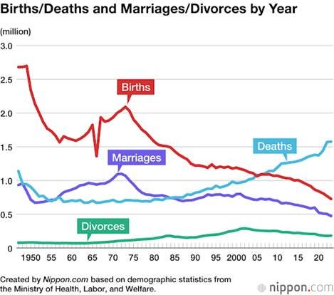 This is the evolution of Japan's fertility rate, which fell to near replacement (2.1) as early as 1958, and definitively crossed the line below replacement in 1974, so in 2023 it was around 1.2, almost half of what is needed to sustain, naturally (without immigration), the country's population: