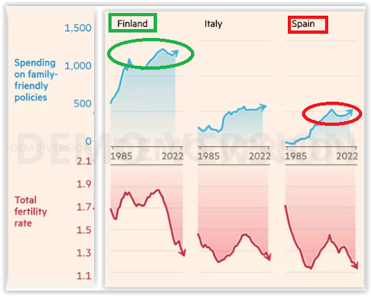 Regarding the argument that pro-natalist policies are necessarily "reactionary" we should, then, think that the Scandinavian social democracies are among the most "fascist" or "reactionary" countries in the world, because they are some of the countries that spend the most and have spent the most on these policies for decades. For example, this is a comparison between the spending per family in Finland and that of Spain and Italy, as well as the evolution of the fertility rates in these countries: