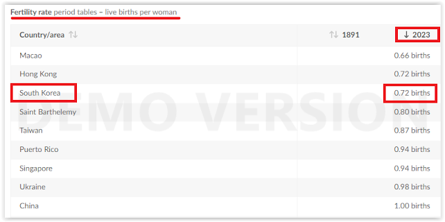 The case of Japan is paradigmatic of the dynamics of the rest of the countries that I'm going to discuss in this post; and Japan can be considered the "canary in the coalmine" a warning of what will happen to the rest of the countries in a few years or decades, since Japan was one of the first countries in the world where the fertility rate fell below the replacement rate (below 2.1 children per woman).