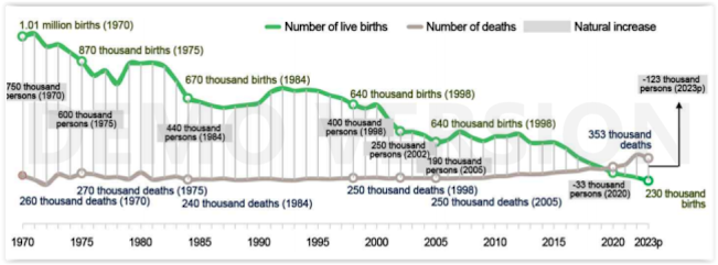 In this graph below you can see how Japan's population growth slows down from the early 1970s onwards and the population grows progressively less and less, so from 2007 onwards the country begins to lose population, and because of this in 2023 the population of Japan have decreased by about 850,000 people and, unless there be a very large change in the net inflow of immigration, this effect will only become more pronounced in the coming years or decades (even if, by a miracle, the fertility rate in that country grows again, since there is a huge "gap" in births).