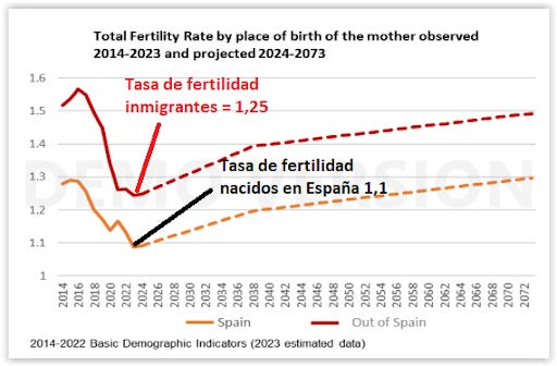 The fertility rate of those born in Spain is , on average, 1.1 children/woman in 2023, while the average fertility rate of those born abroad is 1.25 , only slightly higher than that of those born in our country and in both cases well below the level needed to sustain the population (which, as I have said several times, is 2.1 children/woman).