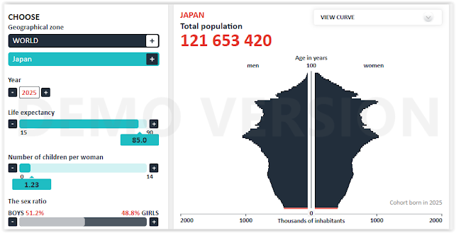As can be seen, Japan had a population of around 122 million people at the beginning of 2025 and we can see that the shape of the population "pyramid" does not bode well for the future of the country, since it can be seen that the "base" of the "pyramid", where the youngest part of the population (children and young people) is located, is getting smaller and smaller, in fact this distribution of the population by age no longer has the classic "pyramid" shape (as it was assumed in the past that the distribution of the population according to age would always be), we could rather say that its shape is becoming more like a truncated rhombus with narrow upper and lower parts and a much wider center, where, in intermediate ages, the bulk of the population accumulates.