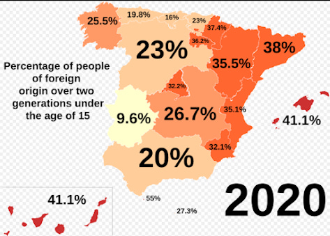 Given that the immigrant population is predominantly young, they are contributing a significant number of children to our society. This map shows the percentage of children under 15 years of age (schoolchildren) who have one of their parents born abroad in the last two generations (foreign parents or grandparents) in 2020: