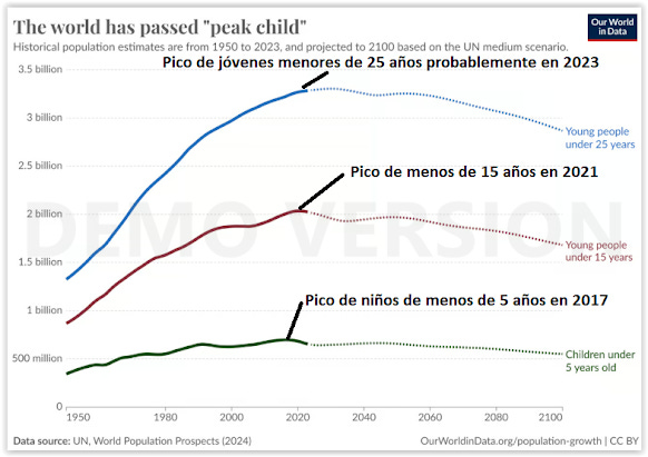 According to data from the United Nations, in particular the " World Population Prospect 2024 ", we have already passed the "peak" of the number of children under 5 years old in 2017 , of those under 15 years old in 2021 and it is estimated that the number of people under 25 years old in 2023 , and it is most likely that there will never again be as many children and young people in the world as there were recently :