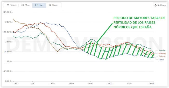As can be seen, Finland (and something similar has happened in the rest of the Nordic countries) began to adopt birth incentive policies since the early 1980s, while Spain only timidly began to do so in the first decade of this century; and as can be seen in the fertility rate trends, Finland had much higher fertility rates than Spain and Italy in the 1980s, 1990s, 2000s and 2010s (almost 4 decades), although it never surpassed the barrier of 2.1 children/woman (natural replacement), and it is only recently that its birth rate has dropped below 1.5 and now has values only slightly higher than those of Spain and Italy (which have been declining since the early 1990s).