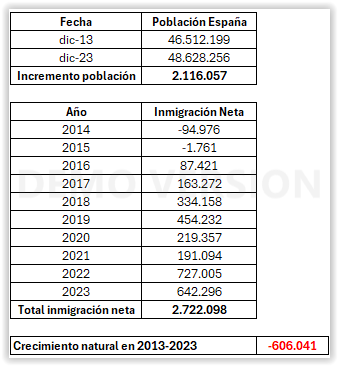 To estimate what the natural demographic evolution of Spain would have been if there had been no net immigration to Spain, I have used the INE (National Institute of Statistics) data for the period 2013 to 2023 and performed the following calculation: