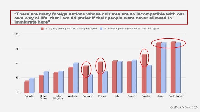 The graph above shows the results of a survey where people in these countries were asked if they think it is correct to state " there are many foreign nations whose cultures are so incompatible with our way of life that I would prefer that such people never be allowed to immigrate here " and as can be seen in the case of Japan and South Korea this opinion is shared by around 80% of respondents regardless of whether they are young or not, well above most other countries where it is very rare for this opinion to exceed 50%, and the countries where this opinion more clearly in the minority range are Canada and the USA, countries that have been formed thanks to immigration.