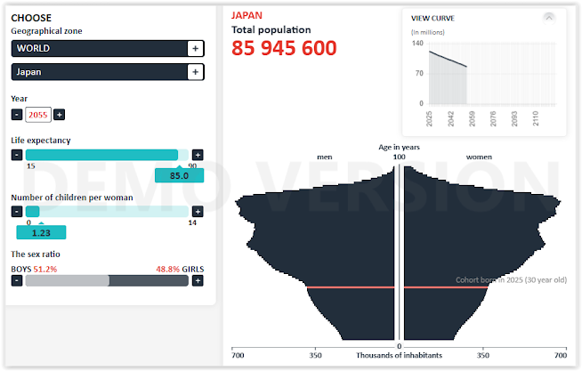 It can be seen that Japan's population in 2055, according to this simulation, will decrease by no less than 35.7 million people, or almost 30% of the population in 2025 (it would be the same population Japan had in 1953, but much older); but this is not relevant, since some might think that Japan (or any other country in the same situation) will do very well with a much smaller population than the current one from many points of view: more job opportunities and better salaries for young people, better access to housing due to a greater availability of empty homes, a much lower environmental impact, less resource consumption, more natural spaces without people, etc. But if you look closely at the population pyramid graph, you can see the immense problems that this could represent, which in my opinion would be: