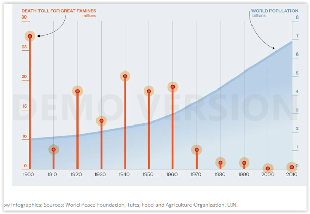As can be seen, there was, in fact, a drastic decrease in famines, both in absolute terms and relative to the population, as the successive decades passed.
