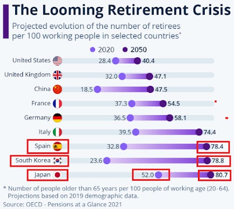 As can be seen, Japan's situation in 2020 was already one of the worst among OECD economies (most developed countries) with 52 people over 65 years old for every 100 people aged 20-65 ("theoretical" working age), and if everything continues as it is today, in Japan in 2050 there would be almost 81 people over 65 years old for every 100 people in the 20-65 age group , it does not seem that this is really very sustainable, and 25 years is not a very distant date in time...