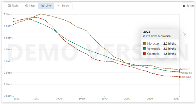 As can be seen, in 2023 the country from which Spain receive the most immigrants, Colombia, had a fertility rate of 1.6 , well below the replacement rate, and if net emigration continues in that country, it will lose population rapidly. Venezuela is already just at the replacement rate ( 2.1 ), with a clear downward trend, that is, in not many years it will begin to lose population and they will start to worry about demographic problems. Morocco has a fertility rate of 2.2 but given that infant mortality is somewhat higher than in developed countries it is quite likely that this is its current natural replacement rate and the trend is for it to decrease rapidly in the coming years as its population becomes more urban, as is happening in the rest of the countries in its area.