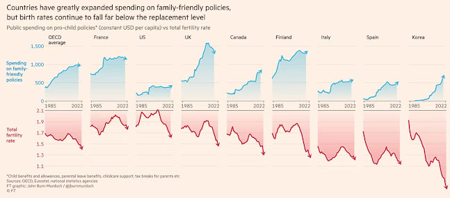 I will also talk about the measures that some countries are taking to try to raise birth rates and which have not succeeded, not even remotely, in raising the fertility rate above the replacement value (2.1 children born on average per woman), because although it is insisted again and again, and people declare again and again, that the reason for the low birth rate is mainly due to economic problems, in reality, as Spengler already pointed out, and studies and statistics point to also, this does not seem to be the case and still no one, no society, no government, no matter how much money they have spent on these pro-natalist policies , knows of any viable way to reverse the current trend, neither among the wealthiest classes nor among the poorest in society; And if the decline in birth rates has already been very intense, they are not even capable of halting the inexorable decline in birth rates that we see in almost all countries of the world, just as happened in the Roman Empire.
