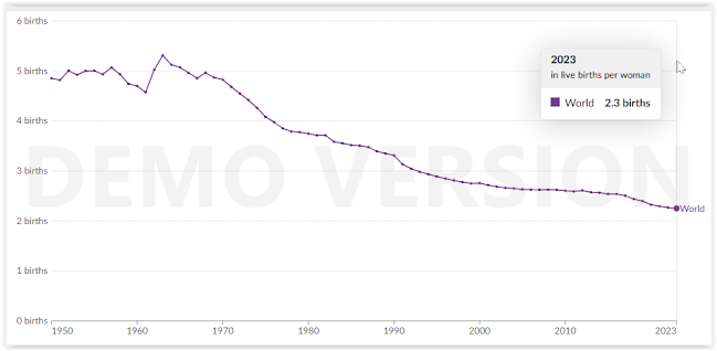 If we add to this the fact that China, with 1.4 billion people, has a fertility rate of 1.0 and we take the average of both countries, which both have a similar population, we see that the average for those two countries is approximately 1.5 children/woman, and we can see that it is actually possible that the global fertility rate is being overestimated .