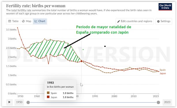If we compare the evolution of the fertility rate in Spain and Japan, we can see one of the reasons why Spain's population is not plummeting (yet) like in Japan: