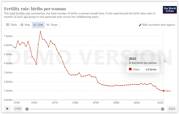 In 2015, the Chinese government abandoned the "one-child" policy and started the " two-child " policy , by which couples who had up to 2 children were not penalized. Later, given the evidence that fertility rates continued to decline, in 2021 the Chinese government introduced the "three-child" policy , where there were no penalties for families who had up to 3 children, of course, and as expected, China's fertility rates have only decreased and are currently around 1.0 children/woman with a clearly downward trend. It seems that the Chinese government still maintained, until at least 2021, the Malthusian theses of the 1970s where the birth rate could only be contained with repression (and according to their own statistics they did not succeed) and of course it seems that they believe that "by lifting the brake pedal" Chinese citizens will begin to have 2 and 3 children per couple overwhelmingly; it seems that they have not read Spengler or looked around to see what has happened around the world, and particularly in their neighboring countries (such as Japan and South Korea).