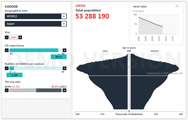 According to this simulation, in 2085 (just 2 generations from now) Japan would lose 68.3 million people from 2025, that is 56% of the population of 2025 and its population would be about 53 million people (from 122 million in 2025), which is the population that Japan had in 1915 (but then that population had a much lower average age).